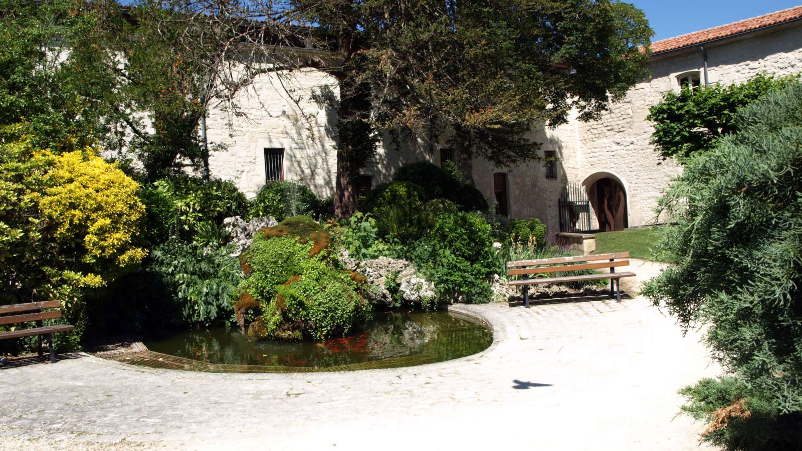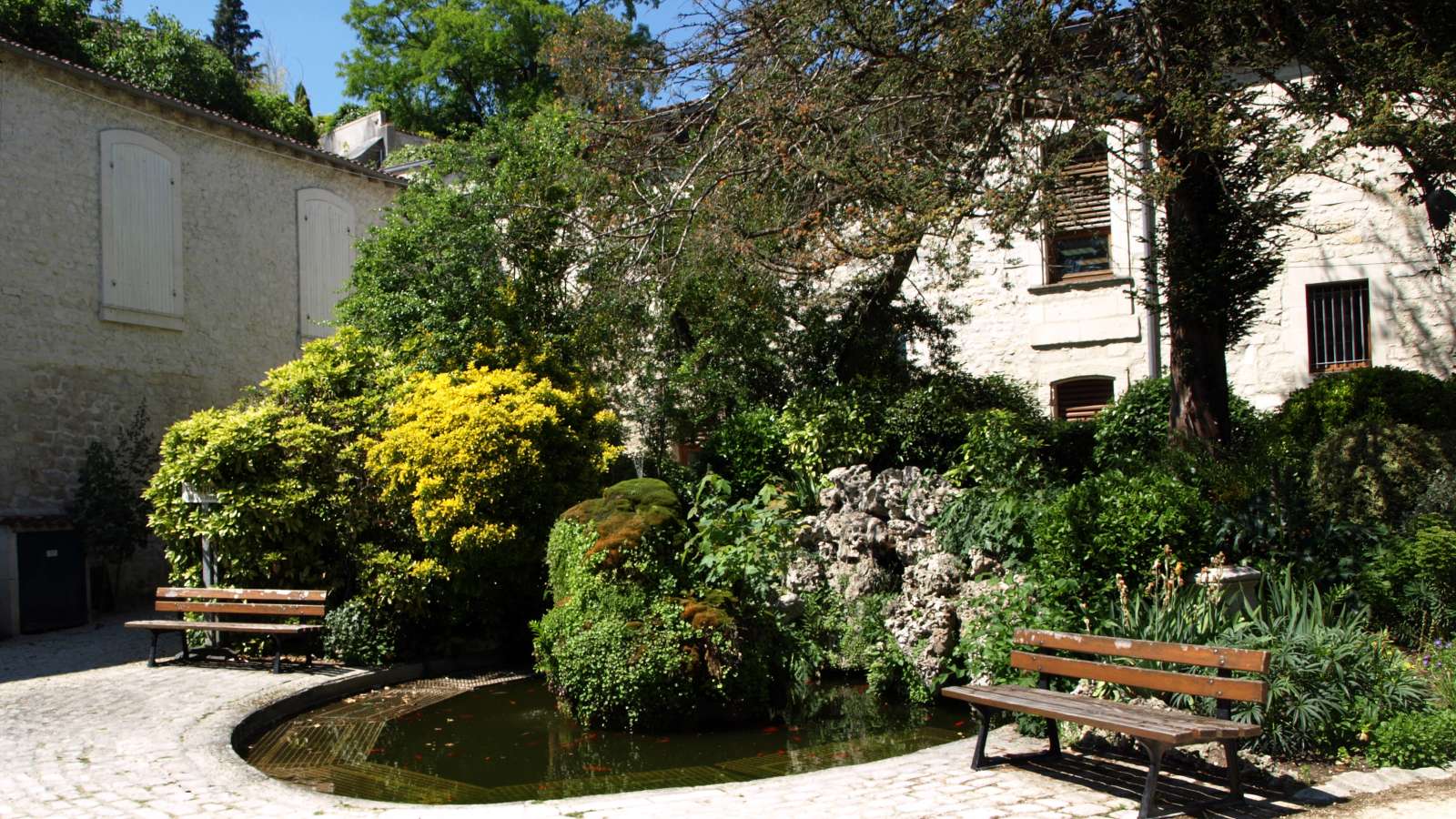 By taking the main alley we discover, along the way, a circular basin embellished with a rockery fountain. Decorated with fish, the basin is delimited from the path by an old-looking stone pavement. It is also adorned with rockery all along the shrubs. Old benches, made of steel and wood, are positioned on either side of the pond. This south-facing space enjoys the most intense sunlight, which is accentuated by the reflection of the sun on the white stone of the facades.