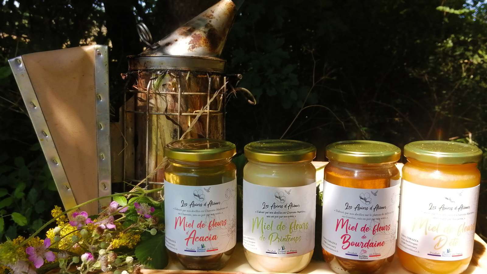 Les Apiers d'Aliénor sells 7 honeys, all from its own production: Spring, Summer, Acacia, Undergrowth and Forest (chestnut) honeys harvested in Charente-Maritime and Charente; Bourdaine and Wildflower honeys produced by moving part of the colonies in May and June to the Millevaches plateau in Corrèze.